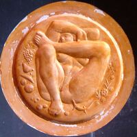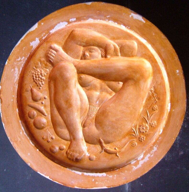 - Molde de escayola del negativo de la cara de una medalla donde se aprecia a una mujer desnuda con una de las piernas apoyada en la otra dejando ver sus partes más íntimas junto a una lagartija y decoración frutal.