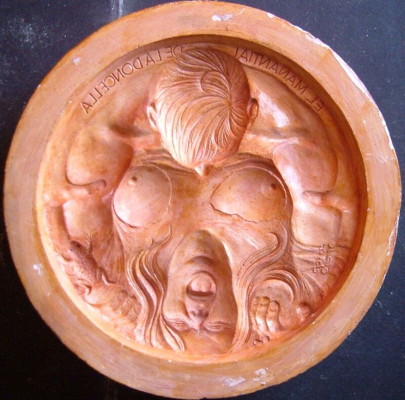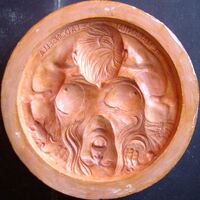 - Molde de escayola, con restos de goma laca, del negativo (las letras aparecen invertidas) de la cara de una medalla donde se representa la escena de una doncella forzada por un hombre.