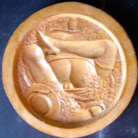 Molde de escayola del negativo de la cara de una medalla donde se aprecia la escena de una pareja haciendo el amor.