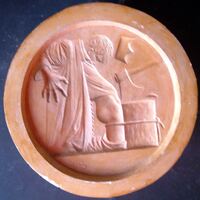 - Molde de escayola, con restos de goma laca, del negativo de la cara de una medalla donde reaprecia a Abelardo de rodillas ante un podio donde le es cortado sus partes más íntimas.