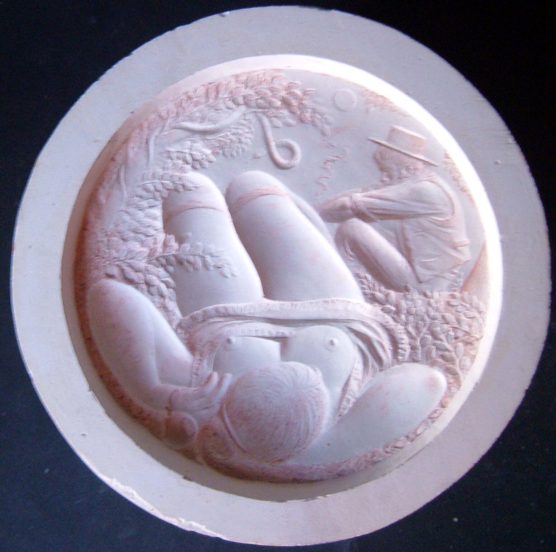 - Molde de escayola del negativo de la cara de una medalla donde se aprecia en primer término a una mujer tumbada con la falda levantada junto a un hombre abatido por la traición.