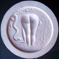 - Molde de escayola del negativo de la cara de una medalla donde se aprecia a Eva desnuda agachada para recoger algo del suelo junto a una serpiente que se le acerca con una manzana en la boca.