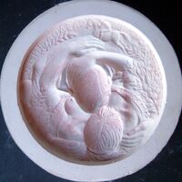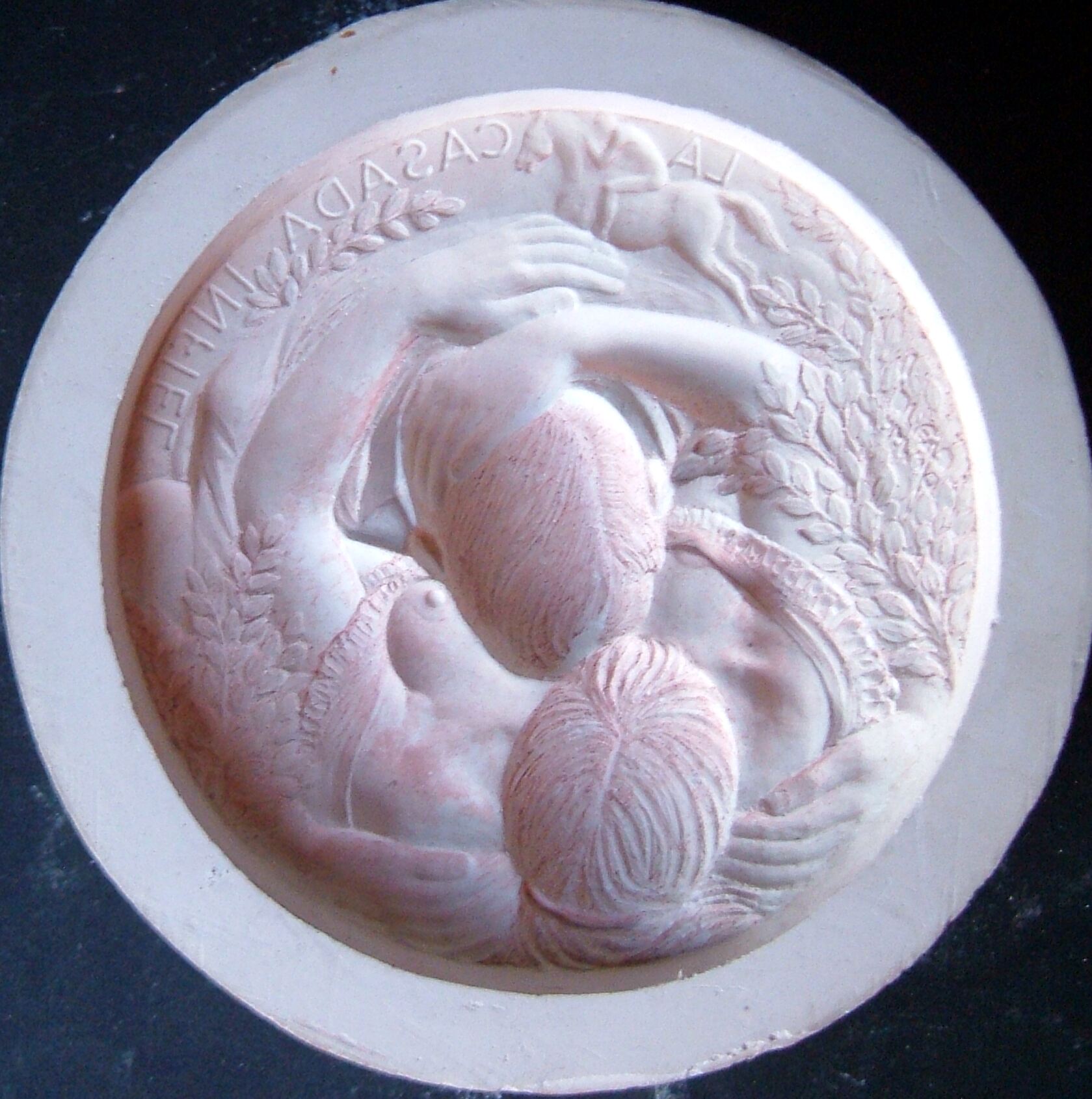 - Molde de escayola del negativo (las letras aparecen invertidas) de la cara de una medalla titulada La casada infiel, donde reaprecia a los amantes fundidos en un apasionado beso.