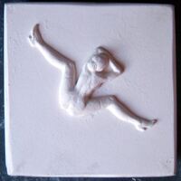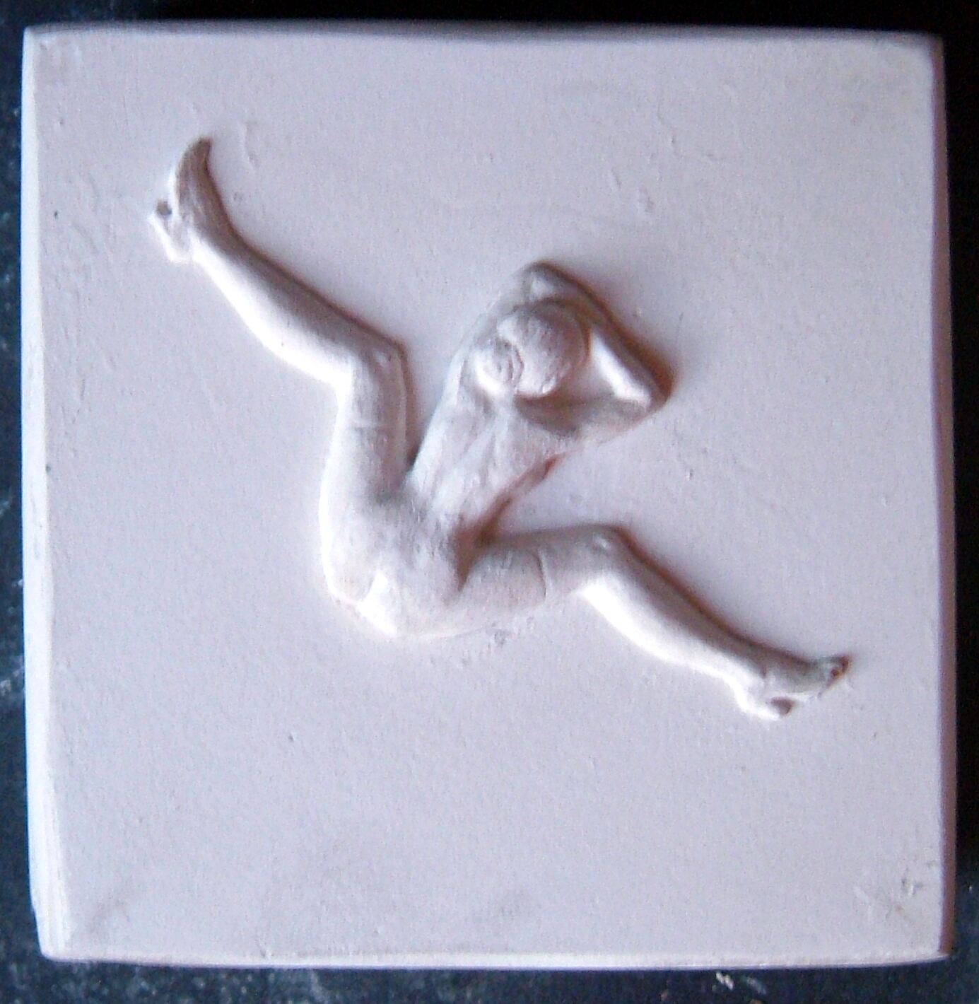 - Molde de escayola donde se aprecia a una mujer con la cabeza bocabajo apoyada sobre sus manos con las piernas abiertas vista desde arriba; parece que podría ser el diseño para algún tipo de juguete.