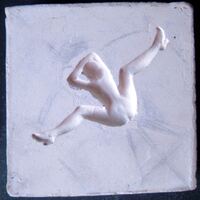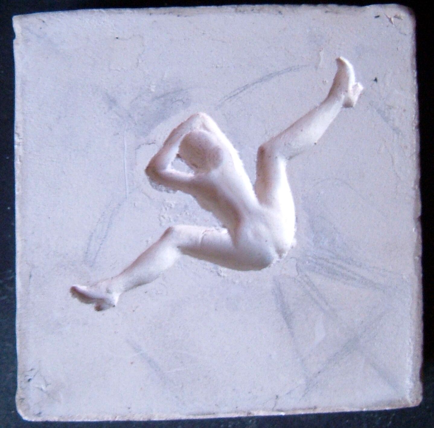 - Molde de escayola donde se aprecia a una mujer con la cabeza bocabajo apoyada sobre sus manos con las piernas abiertas vista desde arriba; parece que podría ser el diseño para algún tipo de juguete.