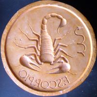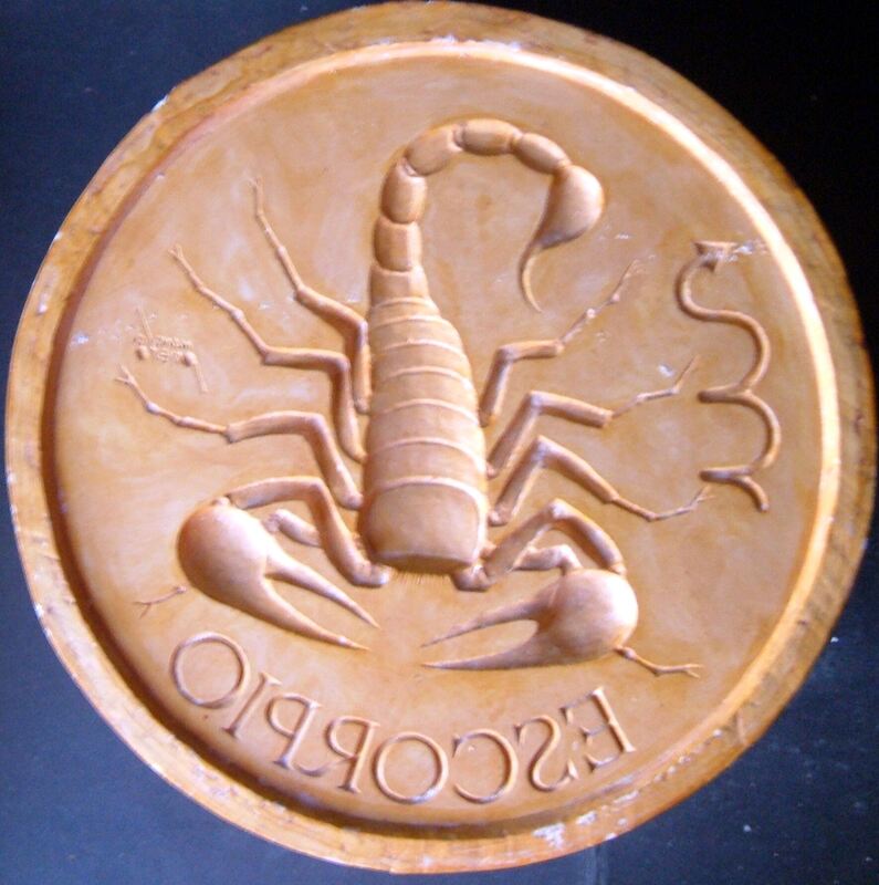 - Molde de escayola, con restos de goma laca, del negativo de la cara de una medalla correspondiente a uno de los signo del zodiaco concretamente Escorpio, representado por la figura de un escorpión.