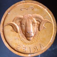 - Bajo el título de “aries” haciendo alusión al signo del zodíaco se ha representado en esta medalla un busto, totalmente frontal, de un carnero. La figura está en alto relieve y la pieza se halla firmada al revés, como corresponde a un negativo.