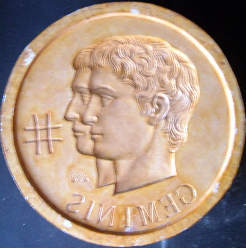 - Dos bustos masculinos de perfil y en alto relieve se han representado en el centro de esta medalla firmada en donde se puede leer “géminis” en su parte inferior haciendo alusión al signo del zodíaco.