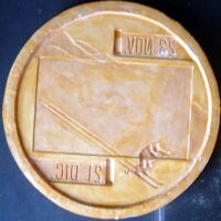 - En el centro de esta medalla en donde se pueden ver dos fechas, una en la parte superior y otra en la inferior, se ha representado, en bajo relieve un cuadrado sobre el que se ve a un esquiador deslizando con sus instrumentos apropiados.