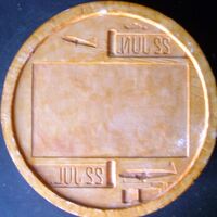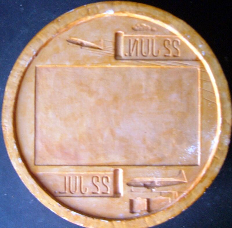 - En el centro de la medalla en la que se ven dos fechas, en la parte superior e inferior, se ha representado un cuadrado en bajo relieve. En la parte superior e inferior parece que se han realizado, también en bajo relieve, dos aviones de un tamaño pequeño.