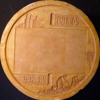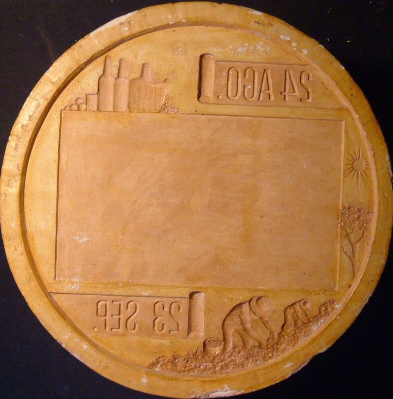 - Por encima y por debajo del recuadro central se han escritos dos fechas y se han representado dos escenas. En la parte superior destacan algunas botellas y en la inferior algunos hombres realizan la recolección de lo que podría ser la uva. La técnica usada es el alto relieve.
