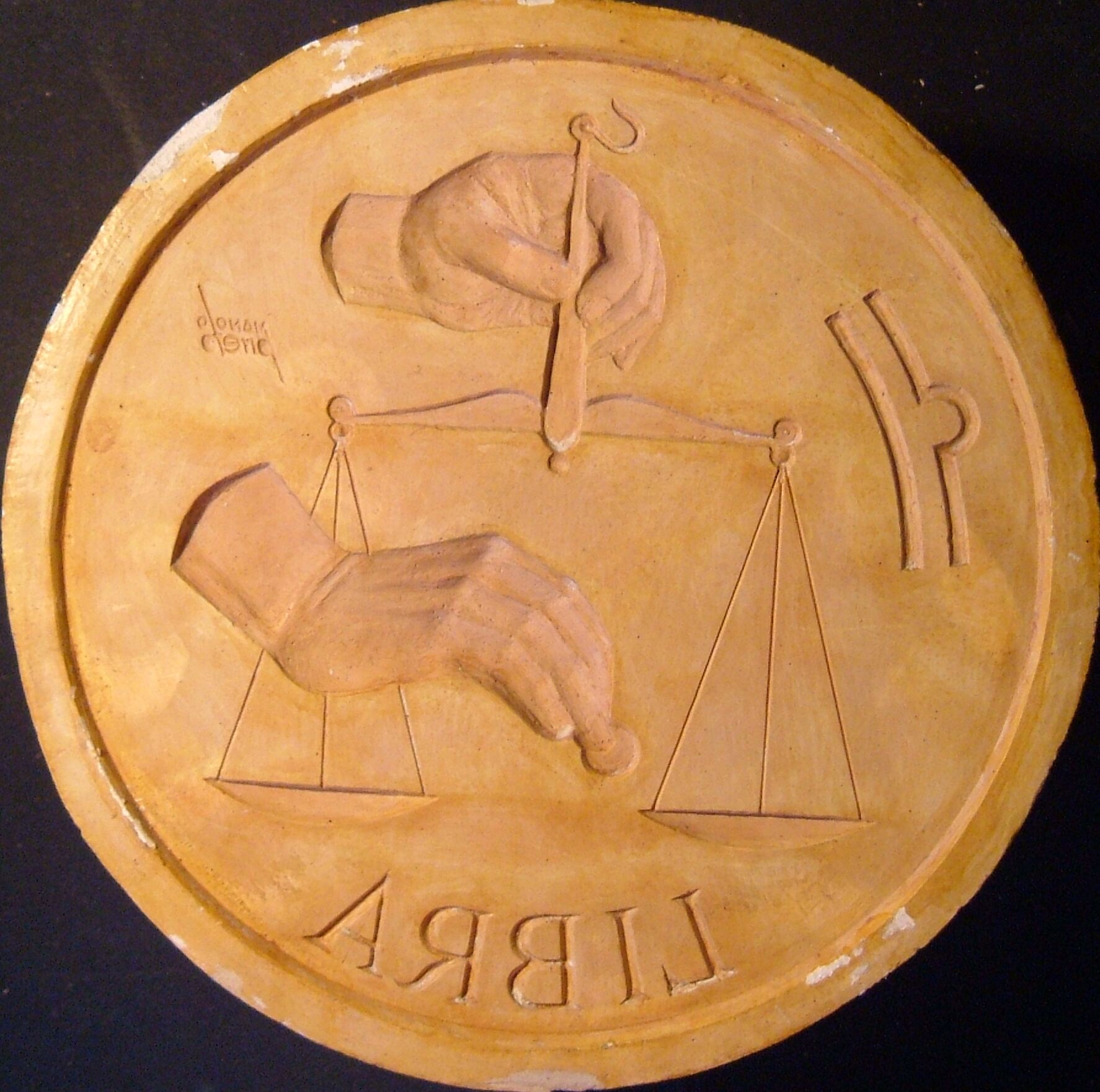 - Siguiendo la técnica del alto relieve se ha representado en esta medalla circular una balanza, una mano con una moneda como si la fuese ha depositar en un de sus platillo mientras que otra mano, en la parte superior, sostiene el objeto. En la parte inferior se puede leer “libra” haciendo alusión al signo del zodíaco. La pieza está firmada.