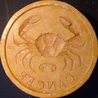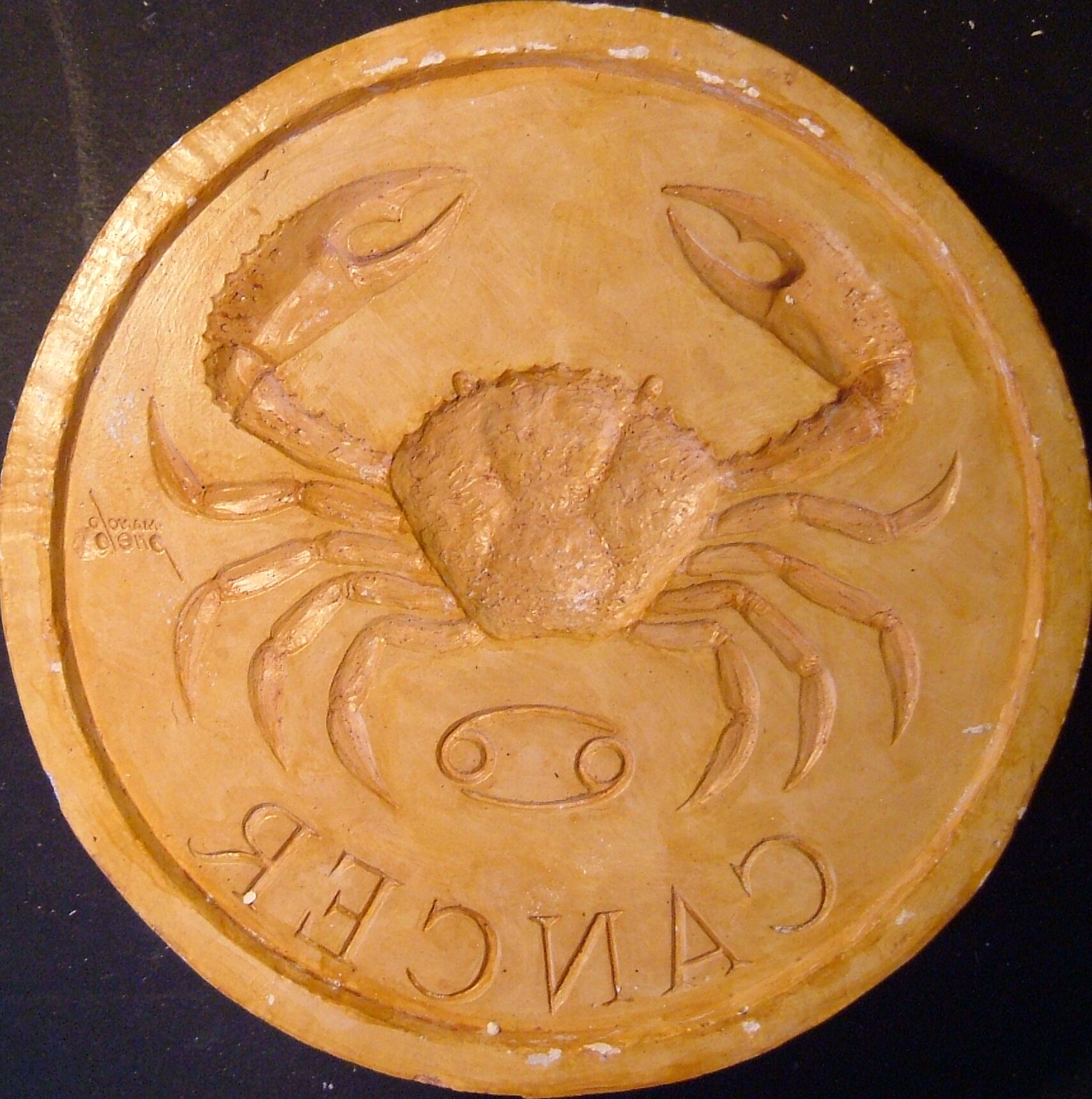 - En alto relieve se ha realizado en el centro de esta medalla circular, con la forma de un cangrejo. En la parte inferior se lee “cáncer” haciendo alusión al signo del zodíaco. Su color se debe a que a la escayola se le impregno en un determinado momento con goma laca de color algo rojizo.