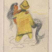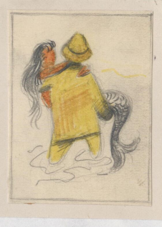 - Escena en la que se representa a un pescador de espaldas cogiendo en sus brazos a la mítica figura de una sirena.Boceto realizado para la ilustración de la revista semanal Novelas y Cuentos. Titulo:Domador de sirenas Autor:Guy y Constance Jones Nº publicado:1220 Fecha:26-09-1954 Tomo NC.:56