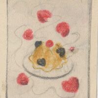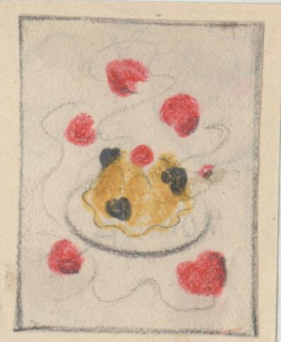 - Dibujo de un postre en amarillo, rodeado y decorado por corazones negro y rojos.Boceto realizado para la ilustración de la revista semanal Novelas y Cuentos. Titulo: Monina. Autor: Gy P. Nº publicado: 1074. Fecha: 09-12-1951. Tomo NC.: 47