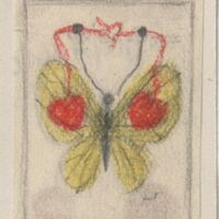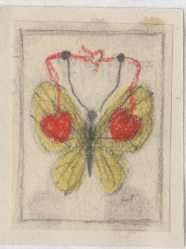 - Boceto de una mariposa con las alas extendidas en tonos amarillos, cuyas antenas sujetan la lazada que une dos corazones rojos que cuelgan sobre la mitad de sus alas.Boceto realizado para la ilustración de la revista semanal Novelas y cuentos. Titulo:La papirusa Autor:Adolfo Torrado Nº publicado:1202 Fecha:23-05-1954 Tomo NC.:40