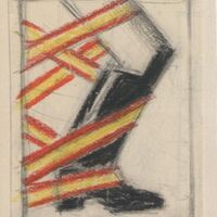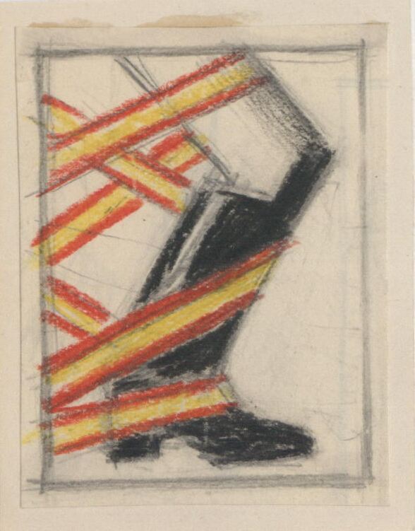 Dibujo de una pierna con bota alta negra, sujeta por una encrucijada de bandas con los colores de la bandera nacional, rojo amarillo, y rojo.Boceto realizado para la ilustración de la revista semanal Novelas y Cuentos. Titulo: Autor: Nº publicado: Fecha: tomo NC.:
