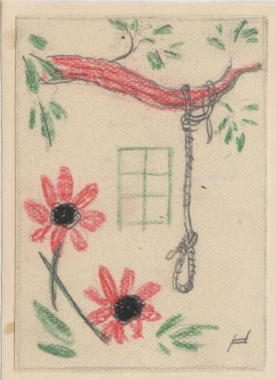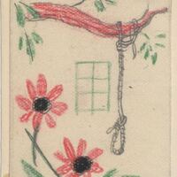 Dibujo donde en el centro de la imagen aparece un rectángulo cuadriculado en verdes, que nos indica que es la ventana desde donde se ve la escena de la rama roja de un árbol de donde cuelga una cuerda con el nudo preparado de la horca, en la parte inferior se observan unas flores, dos con los pétalos rojos y el centro negro. Abocetada la firma del dibujante en la parte inferior.Boceto realizado para la ilustración de la revista semanal Novelas y Cuentos. Titulo:Asesinado dos veces Autor:S.A.Steeman Nº publicado:990 Fecha:30-04-1950 Tomo NC.:48