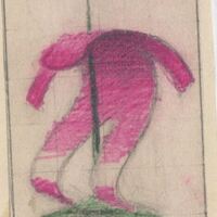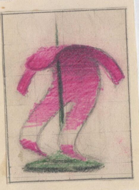 - Dibujo de una figura de papel en tonos rosas, atravesado por una soporte con bástago fino y puntiagudo en tonos verdes.Boceto realizado para la ilustración de la revista semanal Novelas y Cuentos. Titulo: Los crímenes de Broadway. Autor: Edgard J. Doherty. Nº publicado: 910. Fecha: 17-08-1948. Tomo NC.: 8.