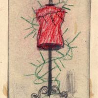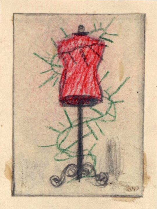 Sobre un fondo claro en primer plano se visualiza el dibujo de un maniquí de cuerpo rojo sustentado por un vástago que termina en un pie, rodeado por una espiral en líneas verdes. El dibujo está enmarcado por una línea de lápizBocet5o9 realizado para la ilustración de la revista de Novelas y Cuentos. Titulo: El marido de la modista; Autor: Henri Duvernois; nº publicado: 903; Fecha 29-08-1948; Tomo de NC 6; Prueba de Imprenta: 338