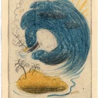 Una ola del mar sobresale con fuerza en la escena y toma la forma de una mano humana sosteniendo un barco entre sus gruesos y azules dedos. De tamaño inferior y situado por debajo de la ola aparece una isla de arenas amarillas y con dos palmeras. El dibujo vuelve a estar enmarcado.Boceto realizado para lailustracion de la revista literaria Novelas y Cuentos. Titulo El Pirata; Autor: Walter Scott; Nº publicado: 892; Fecha:13-06-1948; Tomo 3; Prueba de imprenta: 371