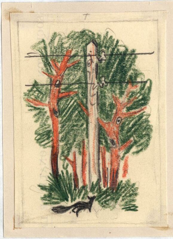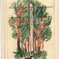 Grandes árboles con troncos muy altos, castaños y sus copas verdes configuran el paisaje en este dibujo, en donde sobresale, también, un poste alambrado. En la parte inferior de la imagen una mancha oscura representa un animal, que perfectamente pudiera ser un zorro.Boceto realizado para la ilustración de la revista semanal Novelas y Cuentos. Titulo: El Bosque Animado. Autor: W. Fernández Flórez. Nº public.: 1181. Fecha: 27-12-1953 Tomo NC.: 30 y 59. PI/. 137.