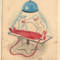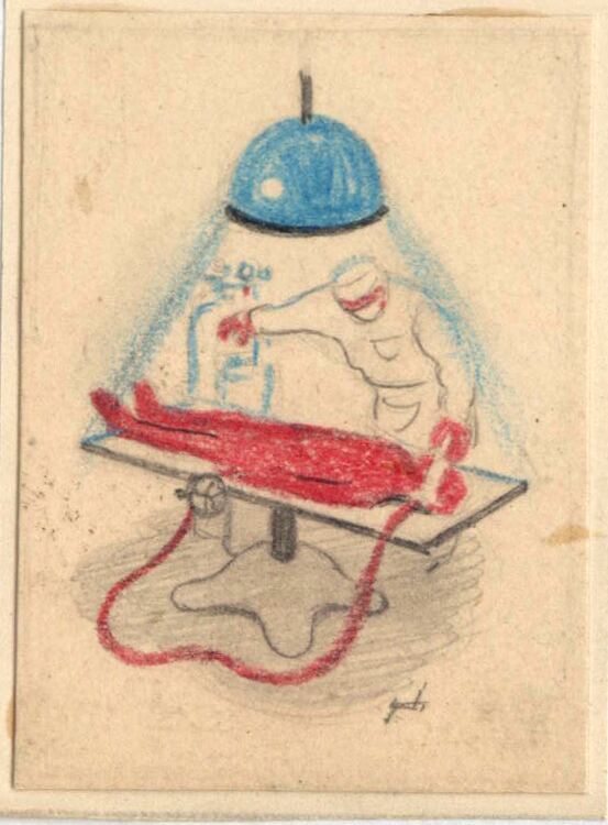 Dicha imagen representa un médico con su bata blanca realizando una operación sobre un cuerpo de piel oscura, el cual se apoya sobre una mesa rectangular sobre un pie de tres patas. Una gran lámpara alumbra al operador y tonos azulados se desprenden de su luz. El pintor ha dejado constancia de su presencia con su firma, apreciable en el lado inferior izquierdo de su dibujo.Boceto realizado para la ilustración de la revista semanal Novelas y Cuentos. Titulo: El Islote de los Cadáveres. Autor: Jarkon Slik. Nº public. 962. Fecha: 16-10-49 Tomo NC. 6. PI/. 290.