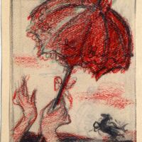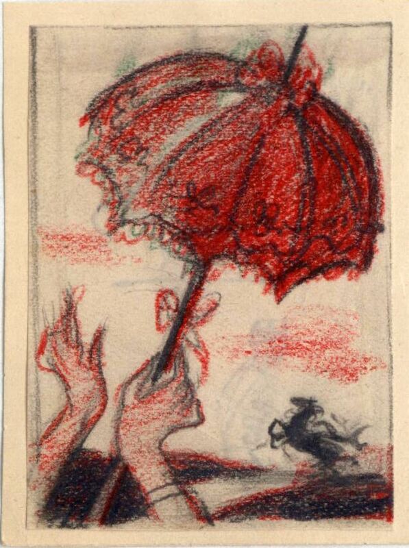Las manos delicadas de una joven sostienen una sombrilla abierta, roja y adornada con pequeños lazos. A lo lejos la imagen de un animal, quizás un caballo negro que salta alegremente. En el dibujo se vislumbra el detalle de un camino.Boceto realizado para la ilustración de la revista semanal Novelas y Cuentos. Titulo: El Jardin del Rey. Autor. P. Margeritte. Nº public.: 815. Fecha: 22-12-1946. Tomo NC. 7. PI/. 302.