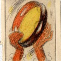 - Un instrumento musical, en este caso una pandereta amarilla es cogida por dos manos, de piel oscura, que la agita en el aire para hacerla sonar. Una escena musical en un dibujo enmarcado.Boceto realizado para la ilustración de la revista semanal Novelas y Cuentos. Titulo: Autor: Nº public. Fecha: Tomo Nc. PI/. No