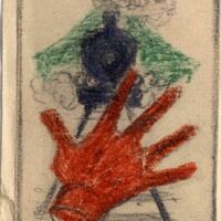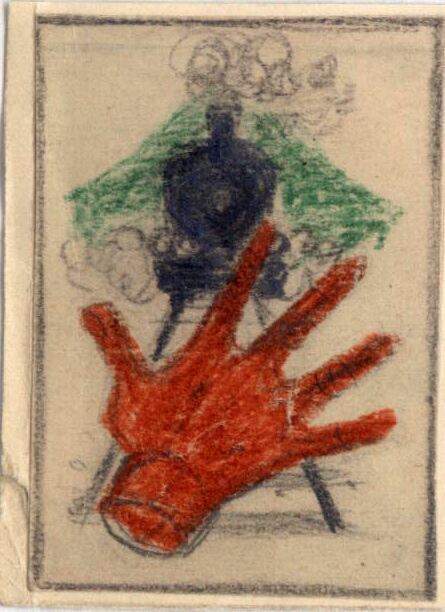 En este dibujo se representa una gran mano abierta y de color rojo que intenta detener un tren. El emblemático dibujo se explicaría con la lectura del cuento. A lo lejos se aprecia un paisaje de montes.Boceto realizado para la ilustración de la revista semanal Novelas y Cuentos. Titulo: Un viaje trágico. Autor: Fred M. White. Nº public.: 902. Fecha: 22-08-1948. Tomo NC.: 2. PI/. 406.