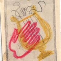 - Se visualiza en la imagen enmarcada la figura de un instrumento musical, en este caso una lira, de color amarillo con sus cuerdas tratadas a lápiz. Una mano de gran tamaño y de color rojo se sobrepone a la liraBoceto realizado para la ilustración de la revista Novelas y Cuentos. Titulo: Tres Tumbas. Autor: E. Kyle Nº publicación: 1043; Fecha 06-05-1951; Tomo NC/. 50 Prueba Imprenta: 74