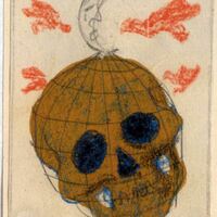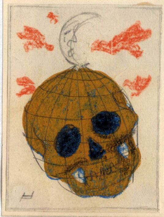 Una gran calavera en tonos castaños y de aspecto siniestro es el tema principal del dibujo. Toda la figura se halla envuelta en una red de grandes cuadrados. En la parte superior se vislumbra una luna que parece llorar y a su alrededor unas formas rojizas se asemejan a unas nubes. Es posible vislumbrar el boceto de la firma del artista, en la parte inferior izquierda.Boceto realizado para la ilustración de la revista semanal Novelas y Cuentos. Titulo: La muerte de la Tierra. Autor: J. H. Rosny. Nº publicado: 995. Fecha 04-06-1950. Tomo NC.: 53. PI/. 324.