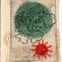 Dos figuras redondeadas forman la composición de esta imagen. En la parte superior como si de un planeta verde se tratase y en la parte inferior, por debajo del anterior, un sol pequeño de color rojo al igual que sus rayos. Unas figuras con forma de nubes se superponen al planeta verde. El dibujo está enmarcado.Boceto realizado para la ilustración de la revista semanal Novelas y cuentos. Titulo:La isla verde AutorPierre benoit: Nº public 986. Fecha: 02-04-1950 Tomo NC.:47 PI/. 91.