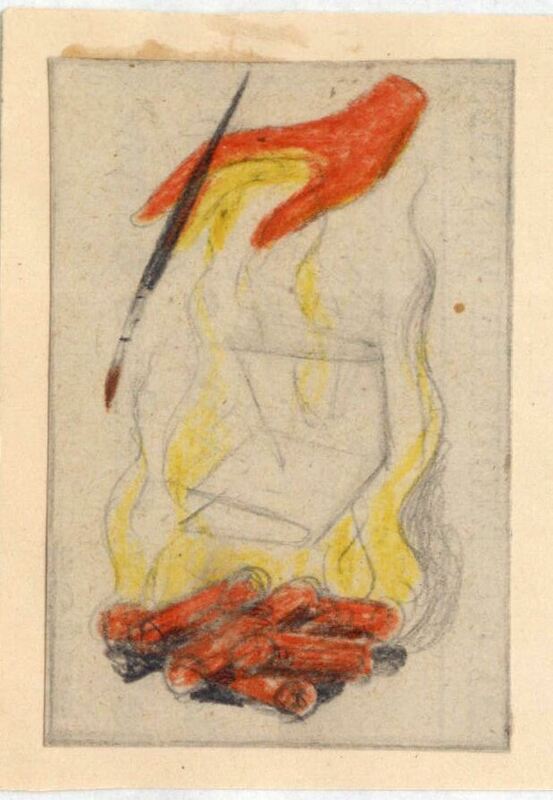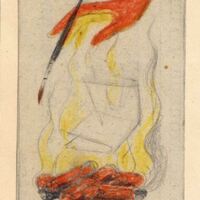 En la parte superior del dibujo se nos muestra una mano roja que sujeta ligeramente un pincel. Bajo la mano cae un papel blanco doblado en una hoguera. El dibujo está enmarcado.Boceto realizado para la ilustración de la revista semanal Novelas y Cuentos. Titulo: El Desquite. Autor: Matilde Aigueperse. Nº publicado: 1101. Fecha: 15-06-1952. Tomo NC.: 55. PI/ 177