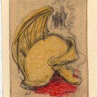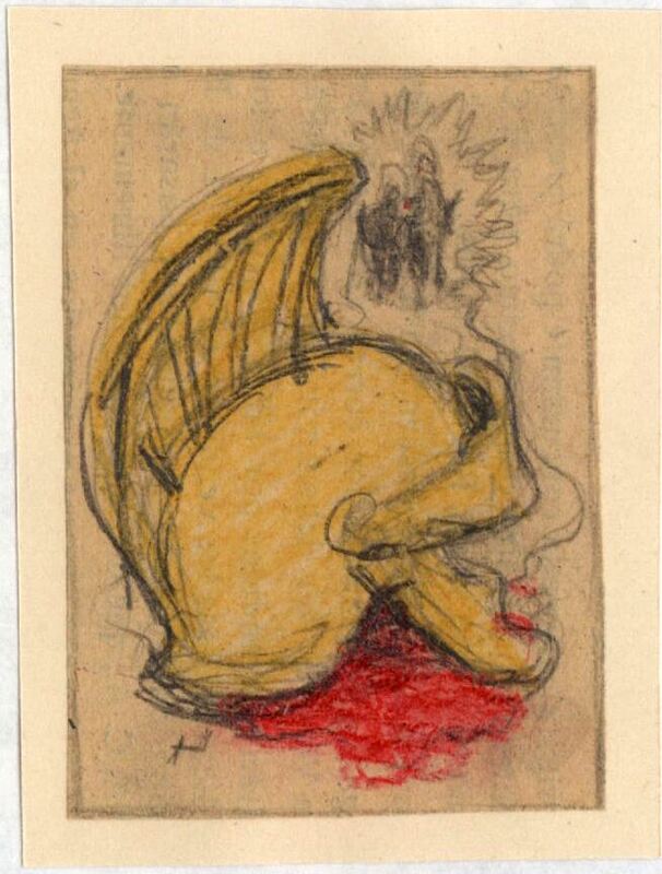 Un casco romano de color amarillo de un tamaño grande ocupa toda la escena del dibujo. En el interior del casco hay sangre que se desparrama sobre el suelo. A lo lejos resalta la aparición de dos santos. El pintor ha firmado su obra.Boceto realizado para la ilustración de la revista semanal Novelas y Cuentos. Titulo: Herodes y Mariena. Autor: C. T. Hebbel. Nº publicado: 1028. Fecha: 20-01-1951. Tomo NC. 49.PI/. 173