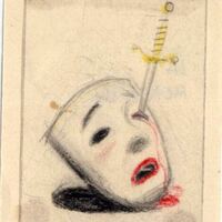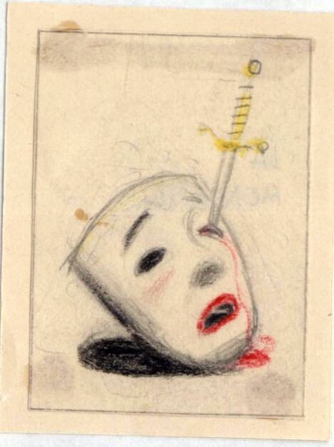 Una máscara de color blanco ligeramente levantada, con la boca roja y abierta de la que se desprende un sentimiento doloroso, se halla atravesada en su ojo izquierdo por una daga. De su ojo herido se desprende la sangre en tonos rojizos claros. Una escena en un dibujo enmarcado.Boceto realizado para la ilustración de la revista semanal Novelas y Cuentos. Titulo: La Montaña. Autor: N. S. Liskov. Nº publicado: 961. Fecha: 09-10-1949. Tomo NC. 8,