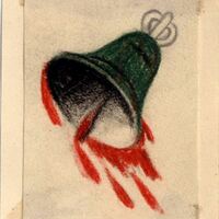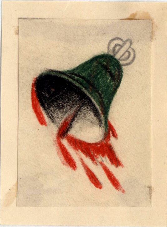 El tema que ocupa este dibujo es una campana. De su parte inferior, manchada de rojo, caen grandes gotas de sangre, en diagonal por efecto del movimiento. El tañer de la campa es posible que tenga que ver con una muerte.Boceto realizado para la ilustración de la revista semanal Novelas y Cuentos. Titulo: La Campana de Huesca. Autor: A. Canovas del Castillo. Fecha: 18-04-1948. Tomo NC. 8.PI/. 331
