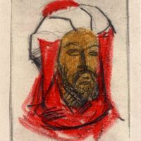 Se ha representado como imagen en este dibujo el busto de un árabe. Su cabeza se envuelve en turbantes de tela roja y en un gorro blanco. La cara del personaje musulmán adquiere tonos castaños y una barba oscura y espesa, al igual que sus ojos y cejasBoceto realizado para la ilustracion de la revista semanal de Novelas y Cuentos. Titulo: Abderraman III; Autor: Mariano Tomás; Nº public. 1341; fecha 20-01-1957; Tomo: 50; PI/. No