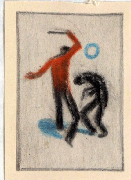 Dos hombres se sitúan en el centro de la escena de este dibujo enmarcado. Uno de los hombres con traje rojo y negro y con un palo en la mano se dispone a pegar al segundo hombre con traje oscuro que se encuentra ligeramente agachado ante el temor de la agresión. Las sombras que se desprenden de las figuras son de color azul y sobre el hombre de negro se encuentra una figura geométrica redondeada de contorno azul.Boceto realizado para la ilustración de la revista semanal Novelas y Cuentos. Titulo: Autor: Nº publicado: Fecha: Tomo NC.:PI/ No