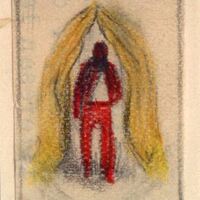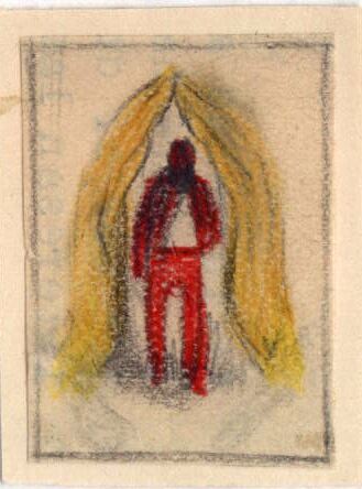 En el centro del dibujo enmarcado una figura masculina con traje rojo y camisa blanca se encuentra entre dos grandes manos amarillas situadas cada una en los lados derecho e izquierdo de la imagen.Boceto realizado para la ilustración de la revista Novelas y Cuentos: Titulo: Sor Juana Autor: Jean Laron nº Publicación: 1017 Fecha: 15-11-1950 Tomo NC. 48 Prueba de Imprenta: 93