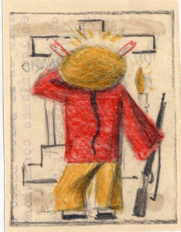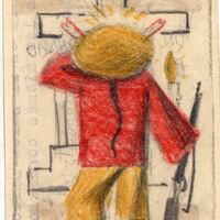 La figura de un chino de espalda con pantalón amarillo, túnica roja, sombrero y una larga trenza observa, mientras coge una escopeta, la imagen de una cruz cuya silueta es negra apoyada en unos escalones. El dibujo se halla enmarcado.Boceto realizado para la ilustración de la revista semanal Novelas y Cuentos. Titulo: Un revolucionario en China. Autor: Pearl S. Buck. Nº publicado: 985. Fecha: 26-03-1950. Tomo NC. 59. PI/. 185