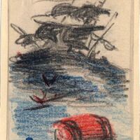 En un fondo azul simbolizando el agua del mar flota un barril de color rojo. A lo lejos se vislumbran los mástiles y velas negras de una carabela, lo que nos simula la idea de un naufragio. El dibujo está enmarcado.Boceto realizado para la ilustración de la revista semanal Novelas y cuentos. Titulo: Las inquietudes de Santi Andía. Autor: Pío Baroja. Nº publicado: 798. Fecha: 25-08-1946. Tomo NC.: 17. PI/. 361
