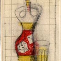 Sobre fondo cuadriculado y enmarcado se han dibujado una botella en forma de mujer como insinuandose y un vaso. A la botella le adornan tres franjas de colores: amarilla, roja en la que hay dibujados unos dados blancos y amarilla, de nuevo. El vaso adquiere unos tonos amarillentos.Boceto realizado para la ilustración de la revista semanal Novelas y cuentos. Titulo: Mujeres … . Autor: Paul Kock. Nº publicado: 1168. Fecha: 27-09-1953. Tomo NC.: 42. PI/. 98