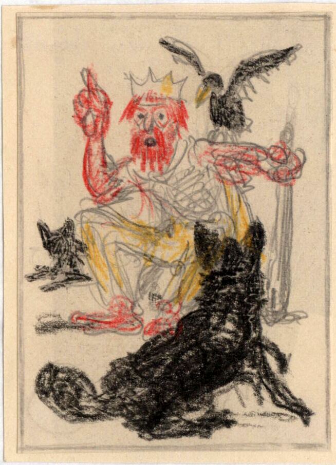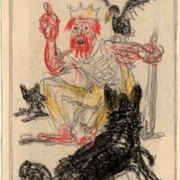 Sentado sobre el suelo un rey de cabello y barba roja coronado, pantalón amarillo y camisa blanca y con un cuervo negro sobre su hombro parece hablar con un perro negro que le mira atentamente y que está de espalda al observador. Detrás del rey asoma la cabeza de otro perro negro. El dibujo está enmarcado.Boceto realizado para la ilustración de la revista semanal Novelas y Cuentos. Titulo: La invasión o El loco Yegot. Autor: Eckmann Chatrian. Nº publicado: 942. Fecha: 29-05-1949. Tomo NC.: 3. PI/. 341