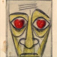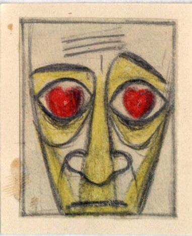 Una cara amarilla, de aspecto triste, caracterizada por grandes trazos contorneados a lápiz y enormes ojos rojos que reprendan dos corazones. Es el gran motivo de la imagen enmarcada.Boceto realizado para la ilustración revista Novelas y Cuentos Titulo: Comedia Sentimental. Autor: Ricardo León. Nº publicado 1054 Fecha. 22-07-1951 Tomo NC. 30. Prueba de Imprenta: 443