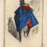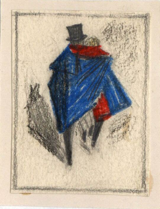 Se observa en este dibujo enmarcado a un hombre de traje rojo que se envuelve en una capa larga de color azul. Sobre su cabeza lleva un sombrero negro, al igual que sus botas largas.Boceto realizado para la ilustración de la revista semanal Novelas y Cuentos. Titulo: El Maestrante. Autor: Armando Palacios Valdés. Nº publicado: 1217. Fecha: 05-09-1954. Tomo NC.: 49. PI/. 521