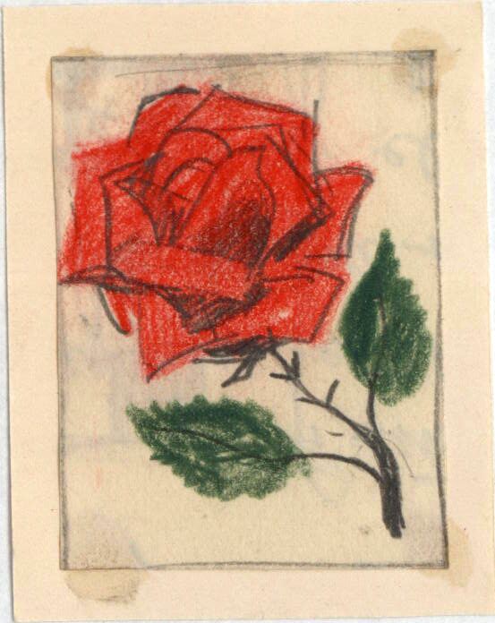 - Sobre fondo claro el artista ha dibujado, enmarcándola, una gran rosa que ocupa todo el espacio. Sus pétalos son de un rojo intensísimo, su tallo con espinas es castaño y a cada lado del tallo crece una hoja.Boceto realizado para la ilustración de la revista Novelas y Cuentos. Titulo: Autor: Nº publicado: Fecha: Tomo NC.: PI/. No