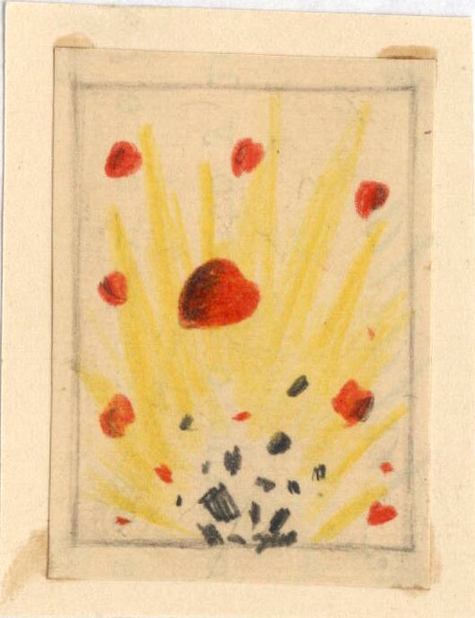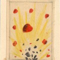 Una explosión hace saltar corazones por el aire. De ella emana una luz amarilla. Inferiormente se ven esparcidos trozos oscuros de algún objeto roto. Toda la escena se encuentra enmarcada.Boceto realizado para la ilustración de la revista semanal Novelas y Cuentos. Titulo: Alcalá de los Zegríes. Autor: Ricardo León. N º publicado: 1113. Fecha: 07-09-1952. Tomo NC.: 37. PI/. 119