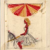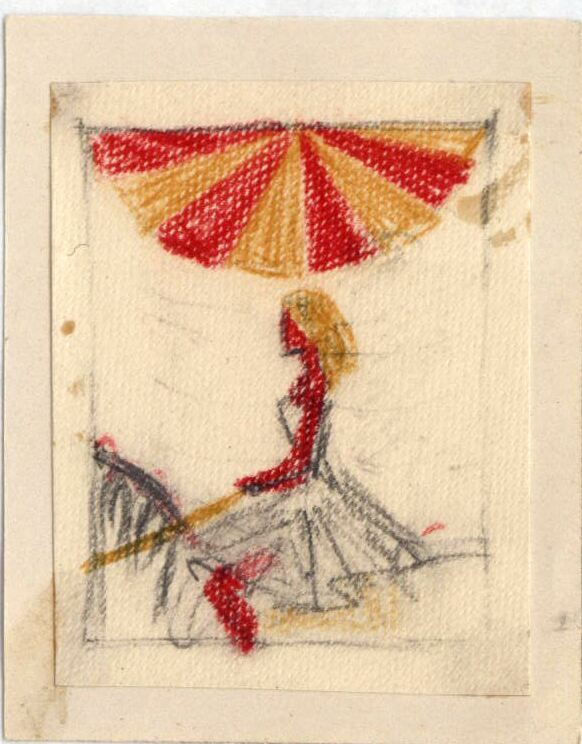 En posición invertido, en la parte superior del dibujo enmarcado, se encuentra un abanico con los colores de la bandera española, rojos y amarillos. En la parte inferior y ocupando el centro una chica de cabellos rubios y vestido blanco cabalga sobre un caballo blanco. Ambas figuras están de perfil.Boceto realizado para la ilustración de la revista semanal Novelas y Cuentos. Titulo: Autor. Nº publi cado: Fecha: Tomo NC.
