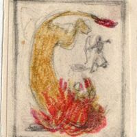 Un león de pelaje amarillento con cabellera de fuego cae retorciéndose de dolor ante la herida causada por una flecha lanzada por un cazador que se encuentra en la lejanía del horizonte. El dibujo está enmarcado.Boceto realizado para la ilustración de la revista semanal Novelas y Cuentos. Titulo: La aguja de oro. Autor: J. H. Rocín. Nº publicado: 1332. Fecha: 18-11-1956. Tomo NC. 53.